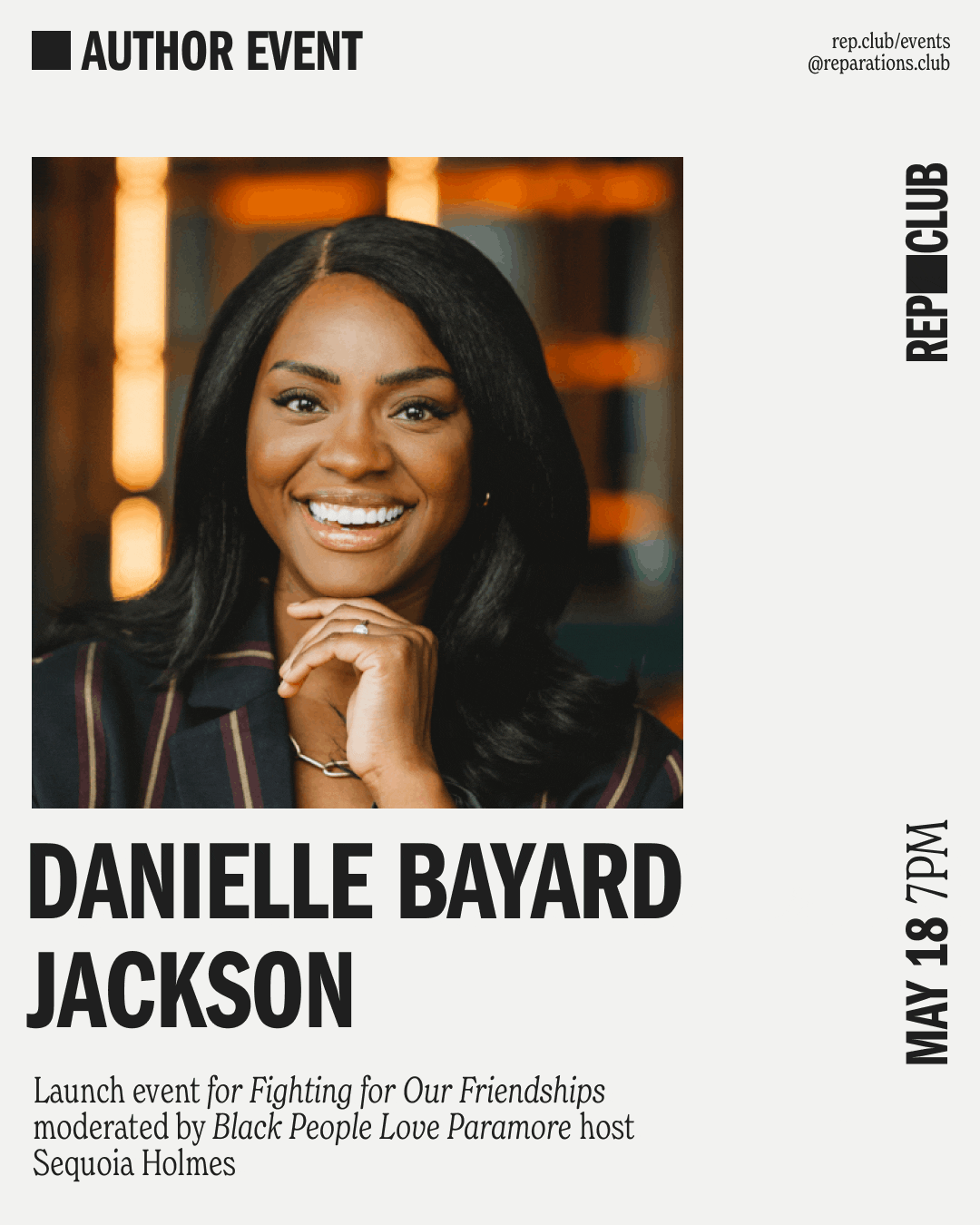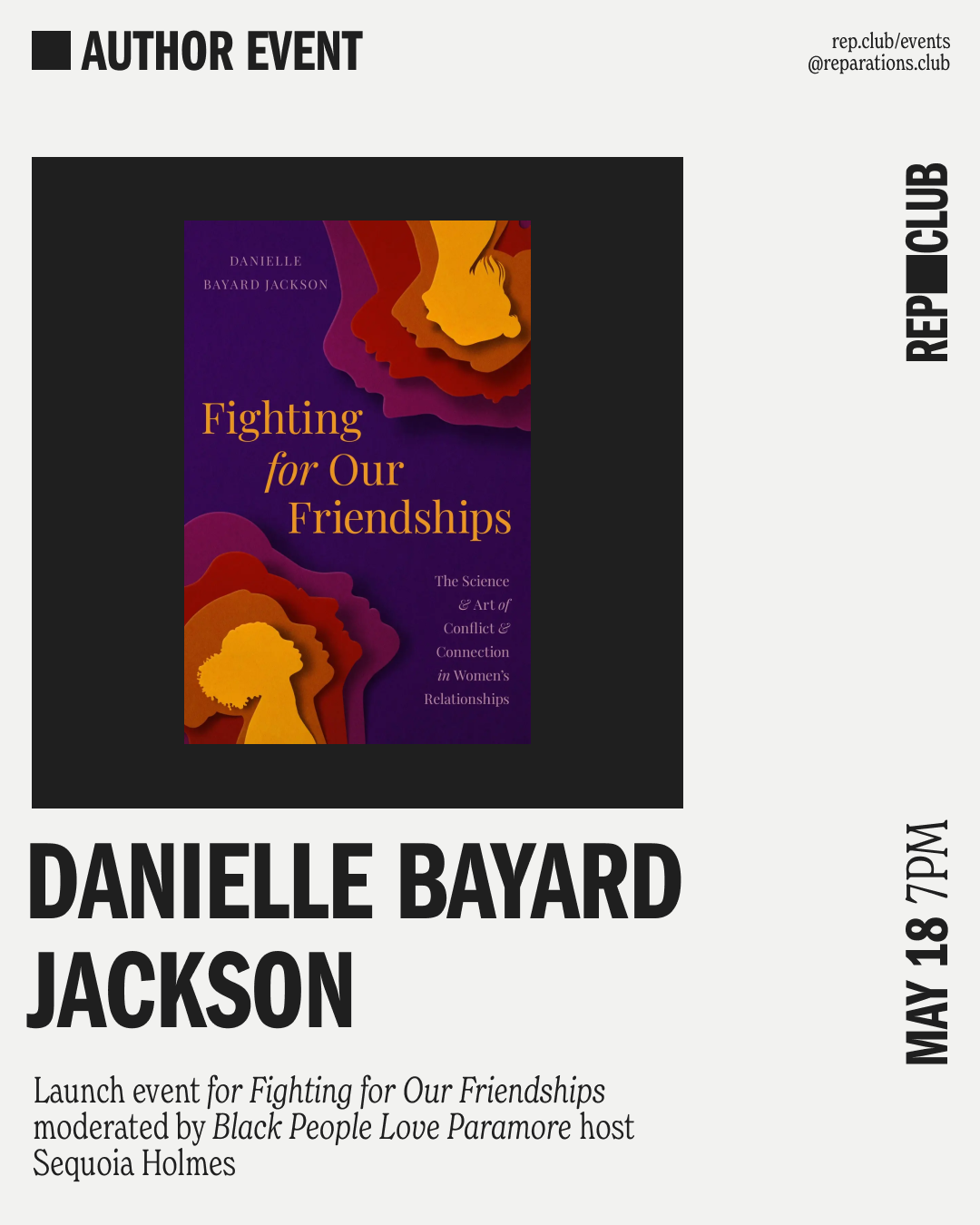 WHO & WHAT: Join us for an IRL EVENT with friendship coach and educator, Danielle Bayard Jackson, as we unpack the latest research about women's cooperation and communication in their new book, Fighting for Our Friendships. Danielle will be joined in conversation with award-winning host of Black People Love Paramore Podcast, Sequoia Holmes.