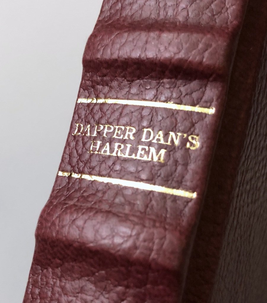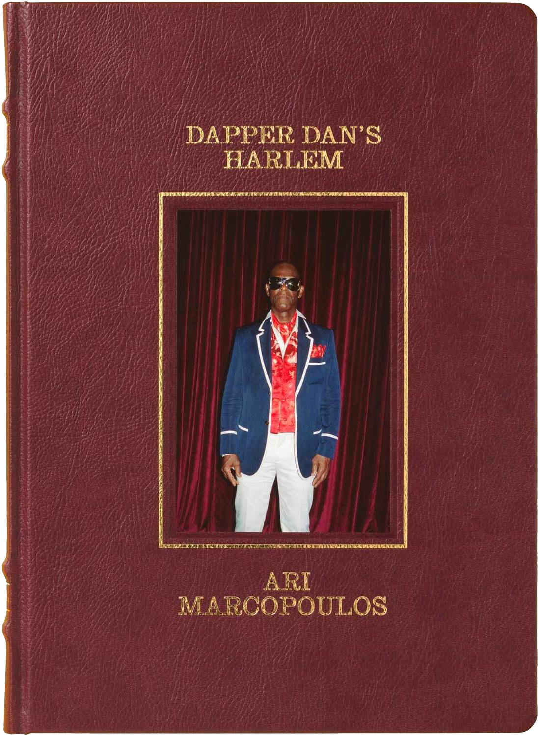 Dapper Dan's Harlem by Ari Marcopoulos is a leather bound, gold text embossed bible of Harlem, where Dapper Dan introduced high fashion to hip hop. Black and white landscape photographs are printed on super think bible paper with tipped in color photographic prints throughout. The color sections explore Dan's atelier and profile the man himself.