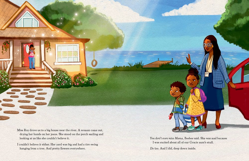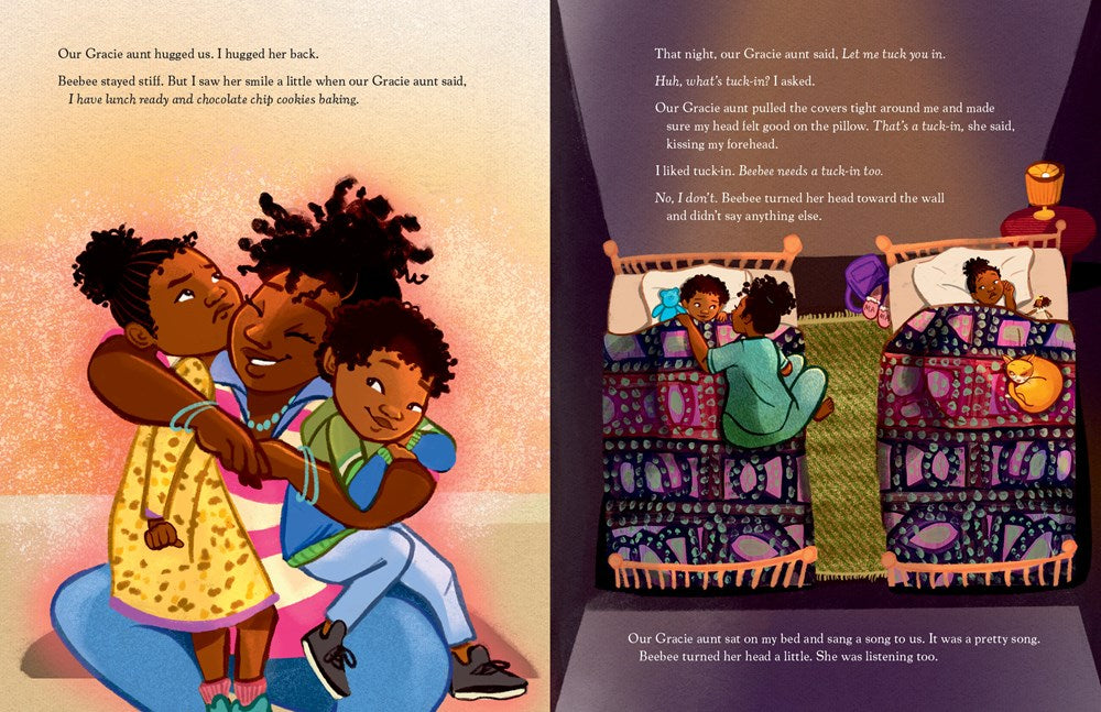 Who is this Gracie aunt? That’s what Johnson wants to know. He can’t remember her, and Beebee doesn’t seem to trust her, at least not at first. But slowly, as the three of them spend time together—cooking, watching movies, snuggling on the couch, and even crying when they need to—they form a bond. And when Johnson sees Mama again, he knows that no matter where he lives, he’ll always be surrounded by love.