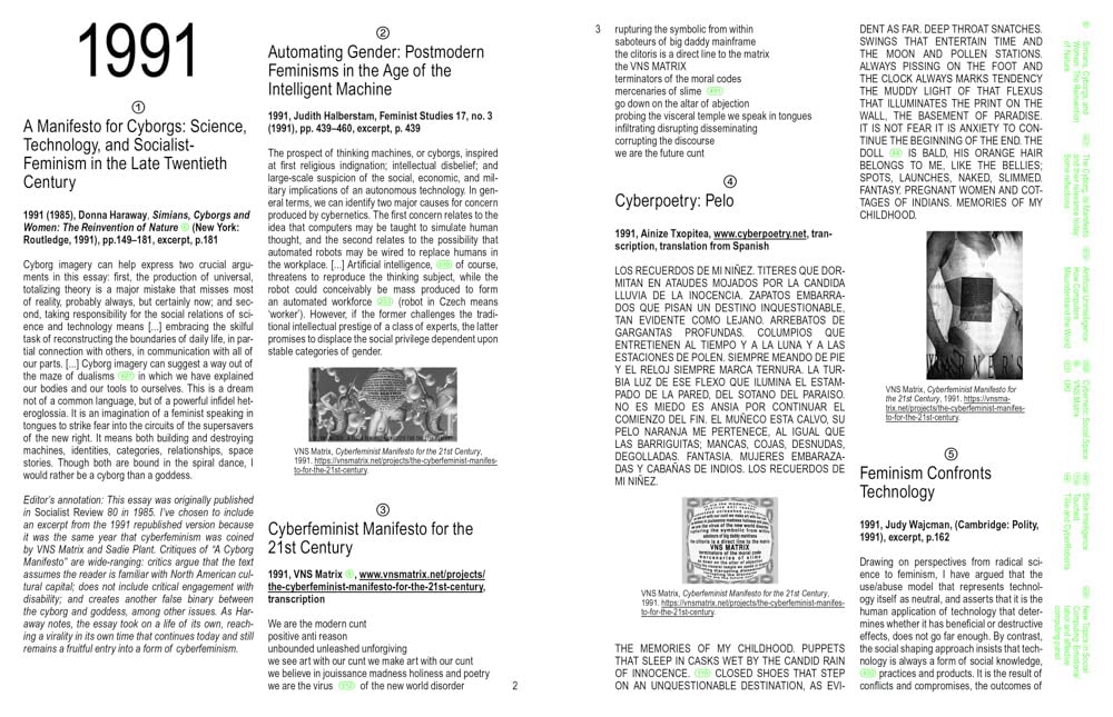 The creation and use of the Cyberfeminism Index is a social and political act. It takes the name cyberfeminism as an umbrella, complicates it and pushes it into plain sight. Edited by designer, professor and researcher Mindy Seu (who began the project during a fellowship at the Harvard Law School's Berkman Klein Center for the Internet & Society, later presenting it at the New Museum), it includes more than 1,000 short entries of radical techno-critical activism in a variety of media, including excerpts from academic articles and scholarly texts; descriptions of hackerspaces, digital rights activist groups, bio-hacktivism; and depictions of feminist net art and new media art.