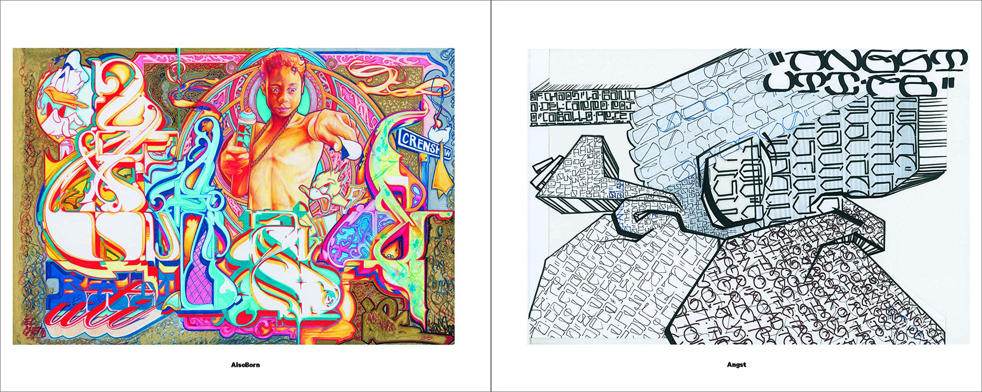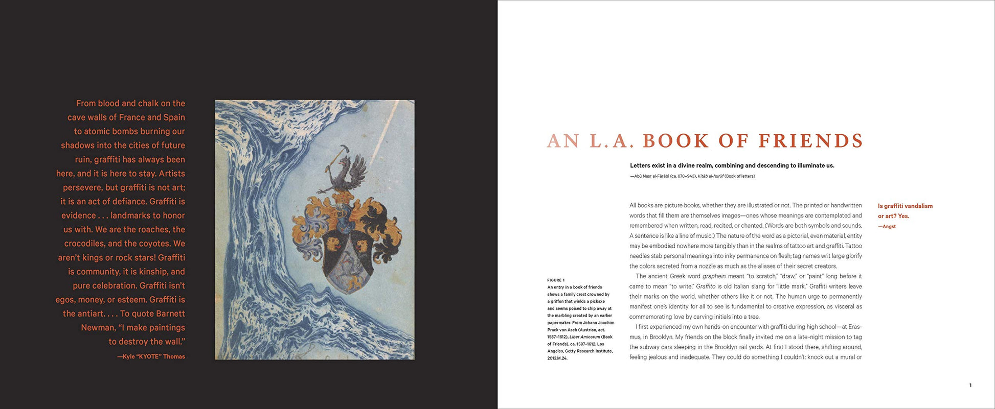Many graffiti artists carry sketchbooks, called black books, and they ask crew members and others whose work they admire to inscribe their books with lettering or drawings. A few years ago, the Getty Research Institute invited artists, including Angst, Axis, Big Sleeps, Chaz, Cre8, Defer, EyeOne, Fishe, Heaven, Hyde, Look, ManOne, and Prime, to consider the idea of a citywide graffiti black book. During visits to the Getty Center, the artists viewed rare books related to calligraphy and letterforms, including works by Albrecht Dürer and Leonardo da Vinci. The artists instantly recognized the connections to their own practices and were particularly drawn to a