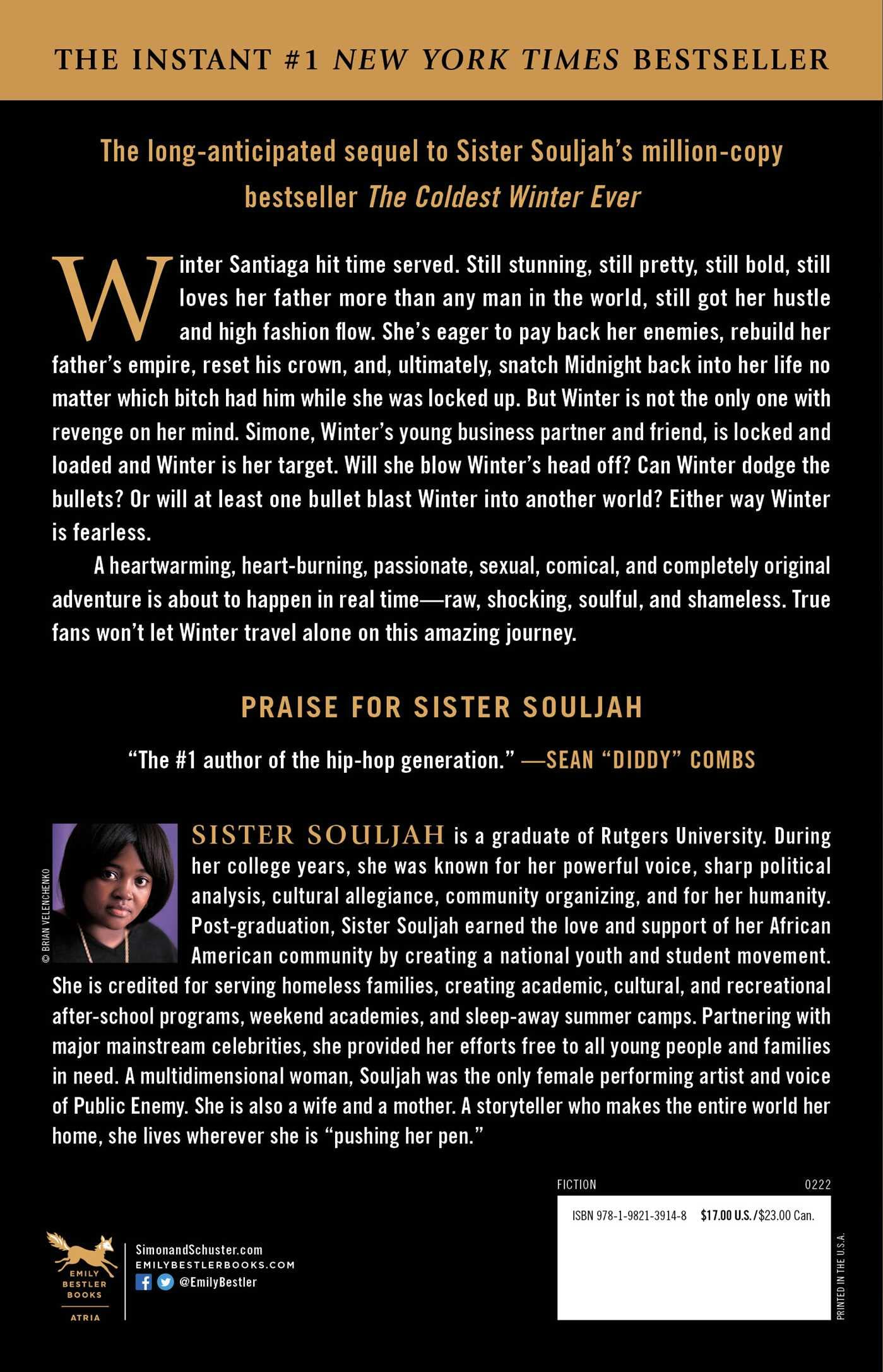 Twenty years ago, Sister Souljah’s debut novel, The Coldest Winter Ever, became a bestselling cultural phenomenon. Fans fell in love with the unforgettable Winter Santiaga, daughter of a prominent Brooklyn drug-dealing family, who captivated her lovers, friends, and enemies with her sexy street smarts. For two decades, fans have begged for answers about what happened to Winter. Now all is revealed in Sister Souljah’s page-turning sequel, filled with her trademark passion, danger, temptation, and adventure. With her jail sentence coming to a close, Winter is ready to step back into the spotlight and reclaim her throne.