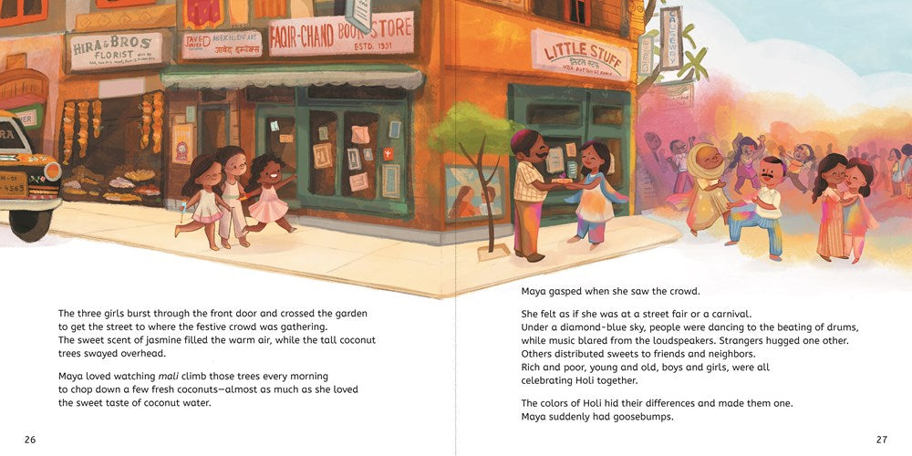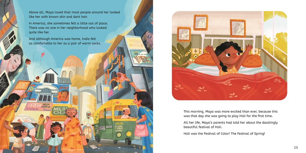Maya loves visiting her grandparents in India, and this year is extra special because she is celebrating Holi with them. Maya and her family start the magical day by eating a special breakfast, including rasgulla dumplings and glasses of mango lassi. They put on colorful clothing and join the celebration out in the streets. The air fills with joyful songs and clouds of blue, red, and purple powder. On this special vacation, Maya can feel the magic of Holi.