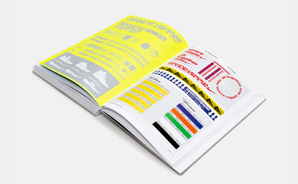 The book's extraordinary design also nods to its contents. The striking cover features overlapping silkscreened layers of Nike's proprietary Volt yellow and Hyperpunch pink colors overlaying an image of world-champion marathoner Eliud Kipchoge printed in a half-tone dot pattern. The book's spine, visible through the clear jacket, showcases a series of colored tabs that extend from its interior pages and which are referenced in the book's bonus chapter, Crafting Color.