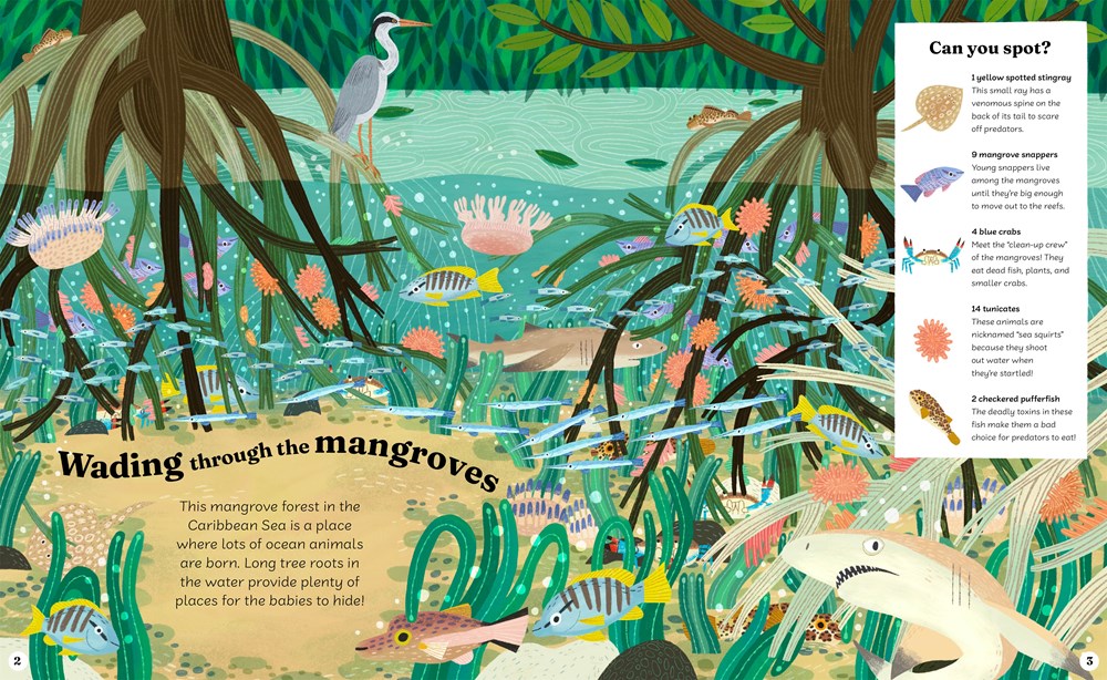 There are millions of creatures hiding in the depths of our oceans! In this beautiful search-and-find book, kids will snorkel around a coral reef, swim along a mangrove, and explore a shipwreck as they have fun for hours searching for sea creatures.
